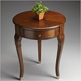 Selected hardwoods, wood products and cherry veneer. Brushed nickel finished leg caps and hardware on single drawer. Dimensions: 22" Diam., 26"H Read more